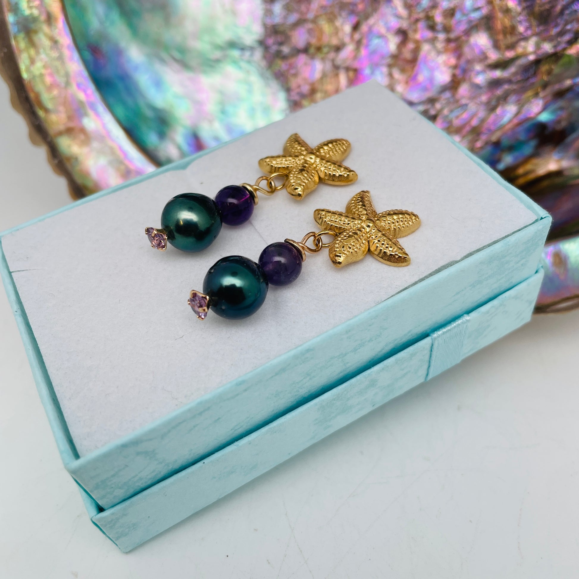 Les boucles d'oreilles AMÉTHYSTE allient bien-être et évasion. Deux magnifiques perles de Tahiti au lustre vert viennent sublimer ce BIJOUX qui nous invite au voyage.