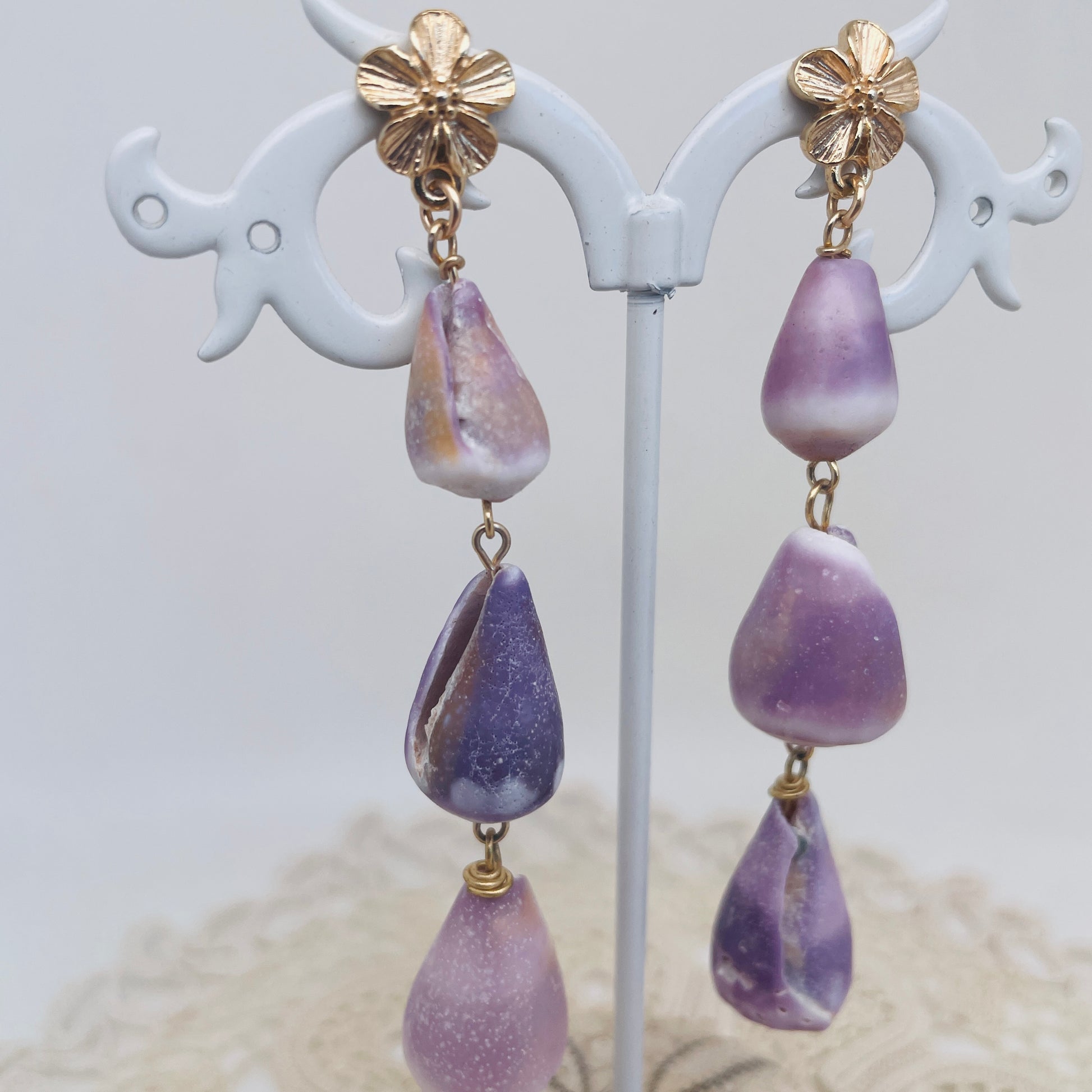 Les boucles d'oreilles MOV nous transportent sur les plages réunionnaises... En effet la créatrice a elle même sélectionné ces coquillages cônes d’une jolie couleur rosée et mauve sur son île d’origine. Une delicate monture fleur en plaqué or vient sublimer ce BIJOUX qui nous invite au voyage.